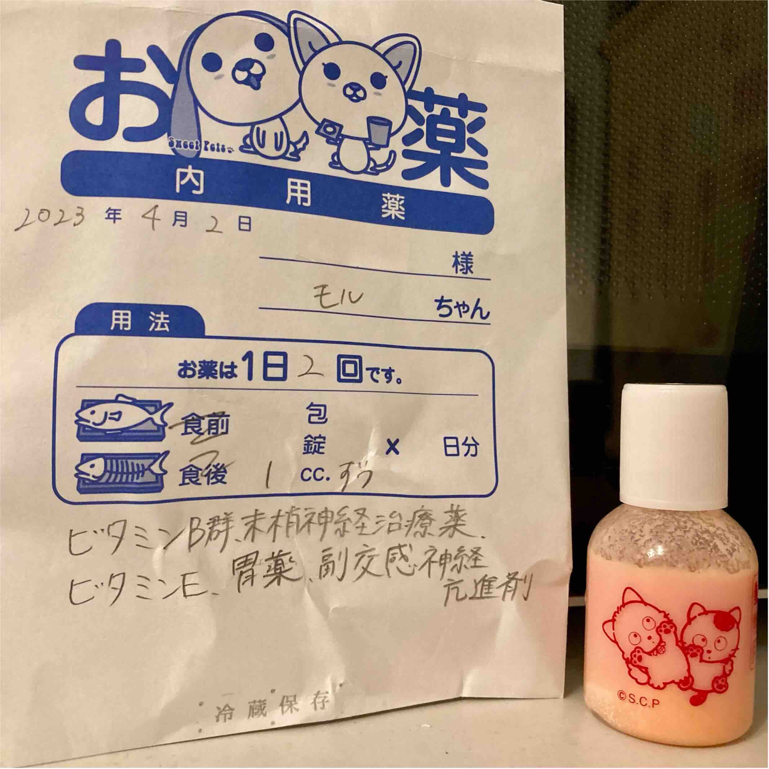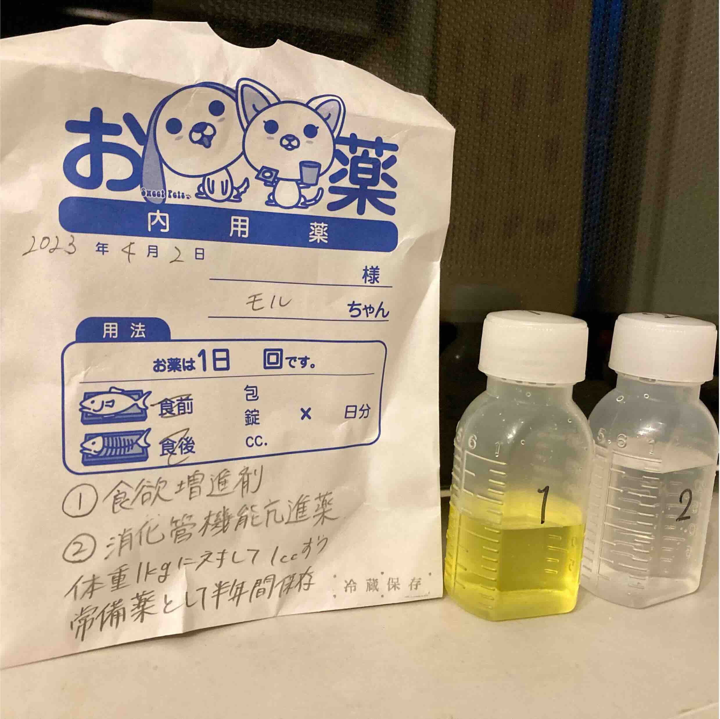 処方された薬をモルに与える。身体はすぐに逆L字型に曲げてしまう。あまり動かず移動も前・後ろ足で、というより腹這いのような状態で前進あるのみ(後退不可)。