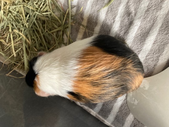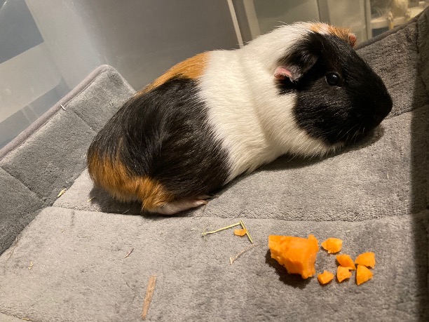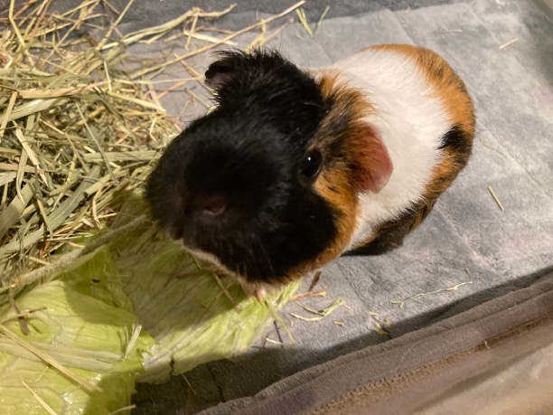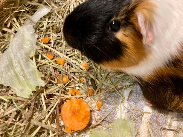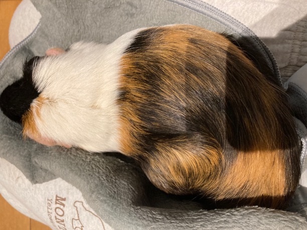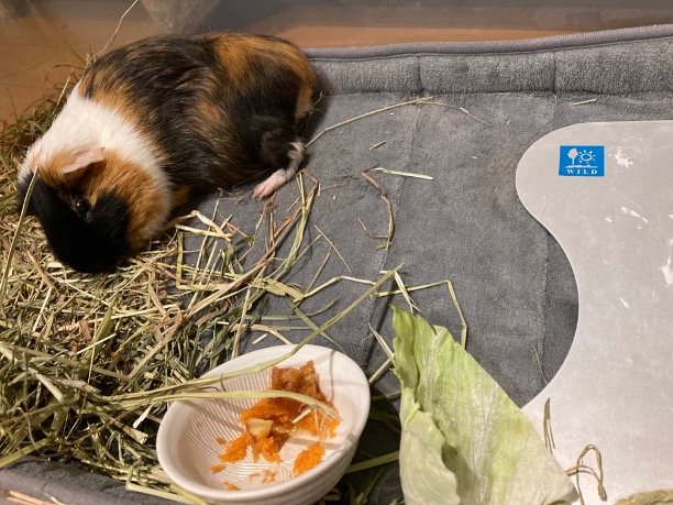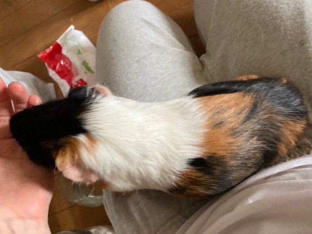 摂食状況は芳しくない。各種サプリメントは通常通り摂取したが、好物のニンジン・リンゴを摂取しない。レタスやチモシーは少々摂取。普段は基本的に野菜のみから水分を摂取していたモル。野菜すら食べないと脱水になってしまうため、シリンジで給水した。モルモット用のピューレを少々レタスに添えてみた。