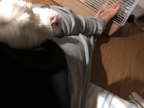 19日、朝。 モルをそっと抱き上げる。私の手のひらの感覚が前日までと明らかに違った。体が「くの字」で硬直しているようだった。触感がメルの死後硬直と似ていた。ケージ内を見ると、うんちは出ていたが量は少ない。肛門付近に詰まってもいたので指でそっと引っ張り出した。 食欲も明らかに減退している、何も食べない。眼力も弱い。そして前日までなんとか踏ん張ってバランスを取っていた前脚も力尽きたようだった。ぐったりしているが私の手に手を乗せてくれる。 職場に有給を申請した。きっと今日だなと思った。最後のときをモルと一緒に過ごしたい。