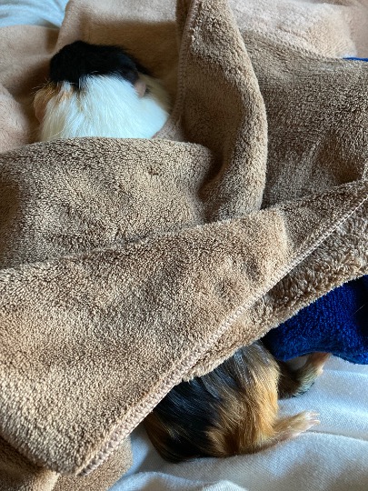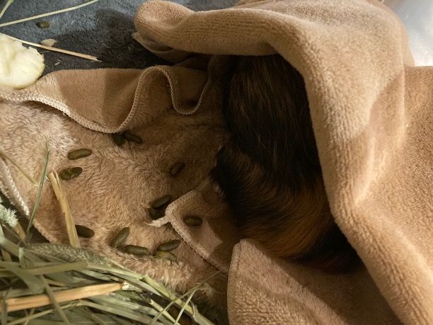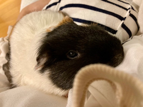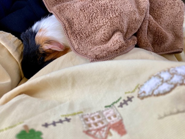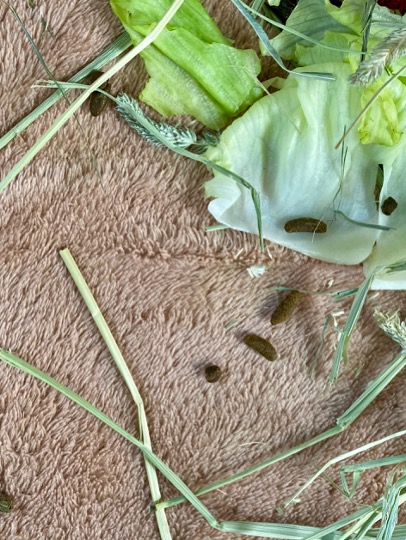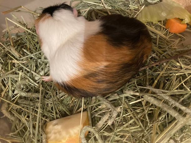 2023年9月1日~9日。モル。食欲はあるようで、好物(りんご、パプリカ、レタス、チモシーの穂など)をよく食べている。他方、うんちのサイズは(個数は問題ないものの)相変わらず小さい。また、以前のように後脚だけで体重を支え前脚を私の太ももなどに乗せることが難しくなったようだ。23/09/08の各写真で確認できるように、左前足の位置もおかしい。他に気づいたこととして、以前にも増してタオルに包まるようになった。さらに、歯がゆいのかいつもよりも枝をよく齧っている。そしてなんと、好物だったはずのニンジンをあまり食べなくなった。