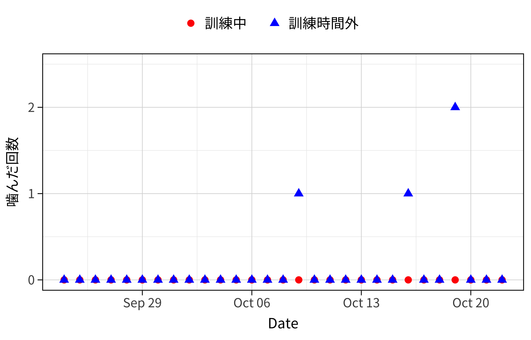 しかし、噛む行動に関しては「完全に無くす」ことがなかなか難しいです(時点での「噛む行動」非出現連続日数はです。なお、ここでカウントしているのは、給餌時(訓練中)における「噛む行動」です。訓練時間外に私たちの不注意によって彼を驚かせて噛ませてしまったケースも含めた記録は図19をご覧ください)。