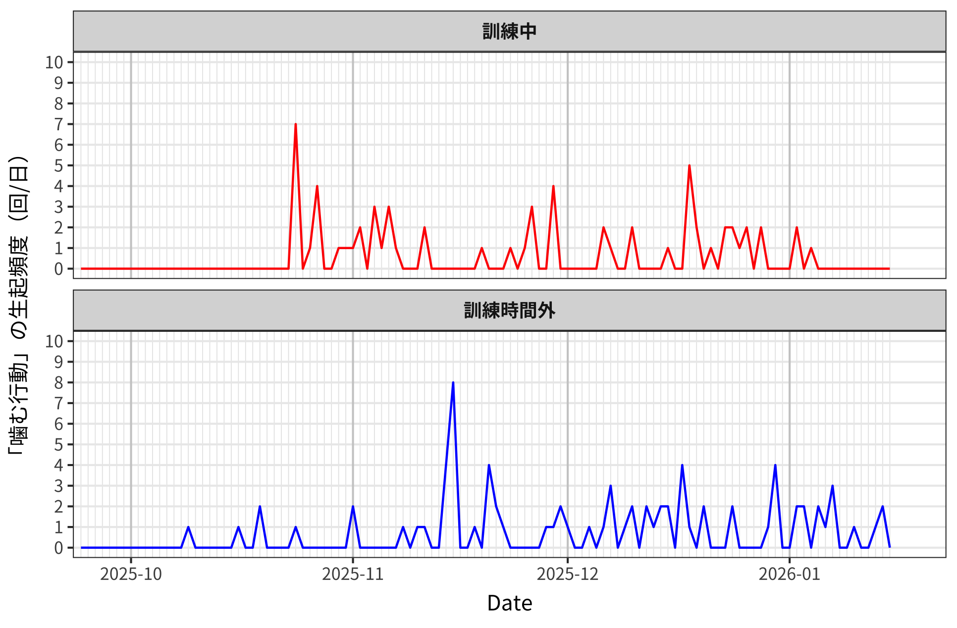 例えば、2025年10月、彼の訓練中に夫婦喧嘩が始まってしまい、彼の「舐める」行動を無視してしまいました。 これによって、不覚にも彼の「噛む」行動を引き出してしまいました。せっかく31日間も訓練中に「噛む」行動が生起しなかったのに。 一度で「噛む」行動が出現してしまうと、その後出現しやすくなる傾向があります。