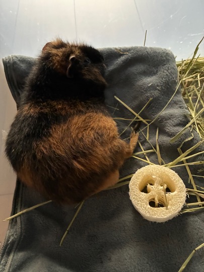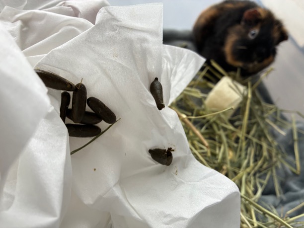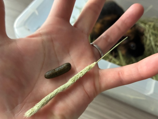 確認できる限りでは一つだけ,先細っているものが混じっていた。なんだろう。。繊維不足だろうか? 相変わらずそれ以外は正常に見える。おしっこもうんちの量も多い。 そして元気だ。本人はタオルで遊んだり,チモシーの中でかやったりしている(そのせいでまた目の表面にチモシーをつけていた)。